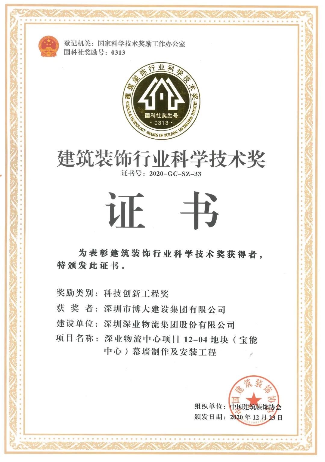 博大建設集團承建的“深業物流12-04地塊(寶能中心幕墻制作及安裝工程)”榮獲二0二0年全國建筑行業科技創新工程獎。